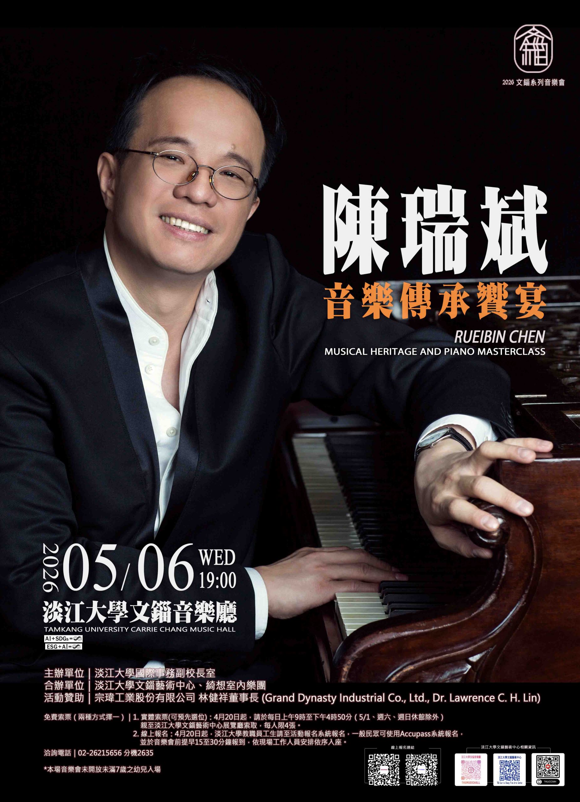 2.不便至現場實體索票的觀眾,請於4月20日起,校內教職員工生請至活動報名系統報名(網址:https://enroll.tku.edu.tw/course.aspx?cid=CCMH20260506),校外人士請至Accupass系統報名(網址:https://www.accupass.com/go/RueibinChen),並於音樂會前提早15至30分鐘報到,依現場工作人員安排依序入座。